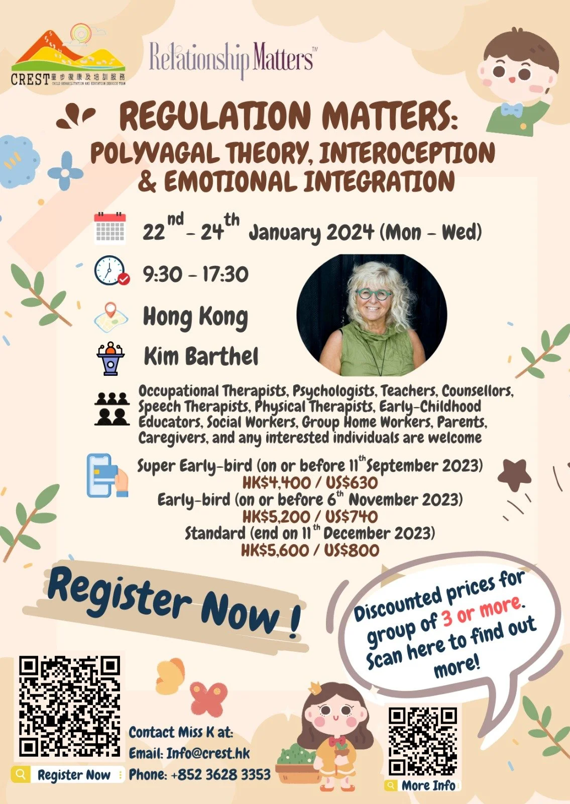 Regulation has become a powerful buzzword guiding behavioural goals and interventions established by clinicians and educators across the world. But what does “regulation” truly mean? This in-person three-day workshop weaves together concepts from Polyvagal Theory, interoceptive processing and emotional integration. Combining theory with practical video demos, labs and problem-solving conversations will support the carry-over from theory into day-to-day application of strategies towards well-being and function. This workshop is relevant to all professionals supporting human beings (especially individuals living with neurodiversity and trauma) who are keen to understand their own regulation and co-regulation literally from the inside-out.